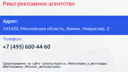 Риал, рекламное агентство по адресу 141420, Московская область, Химки, Некрасова, 2 в дальнейшем Организация, размещена в следующих категориях: