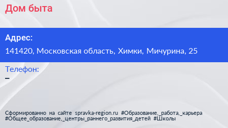 Дом быта по адресу 141420, Московская область, Химки, Мичурина, 25 в дальнейшем Организация, размещена в следующих категориях: