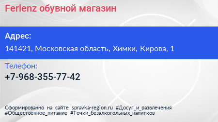 Ferlenz, обувной магазин по адресу 141421, Московская область, Химки, Кирова, 1 в дальнейшем Организация, размещена в следующих категориях: