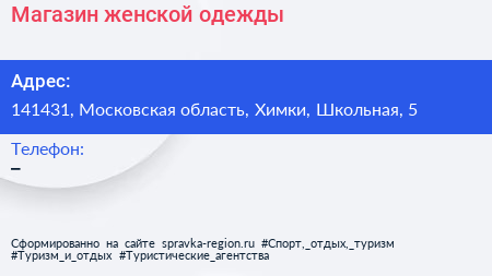 Магазин женской одежды по адресу 141431, Московская область, Химки, Школьная, 5 в дальнейшем Организация, размещена в следующих категориях: