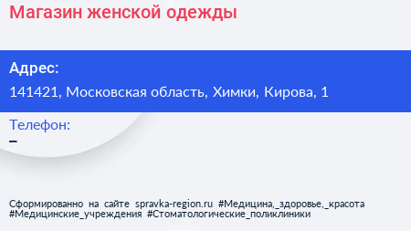 Магазин женской одежды по адресу 141421, Московская область, Химки, Кирова, 1 в дальнейшем Организация, размещена в следующих категориях: