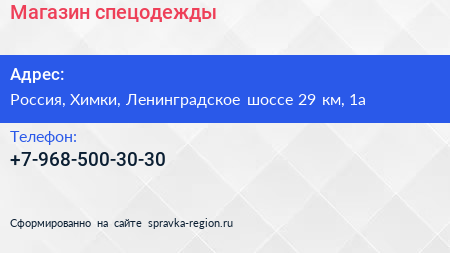Магазин спецодежды по адресу ТЦ Ленинградка, 2, Ленинградское шоссе, Черкизово, Молжаниновский район, Новоподрезково, Химки, городской округ Химки, Московская область, Центральный федеральный округ, 141436, Россия в дальнейшем Организация, размещена в следующих категориях: