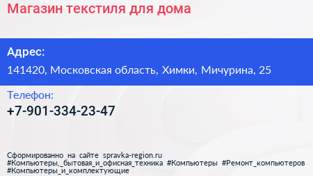 Магазин текстиля для дома по адресу 141420, Московская область, Химки, Мичурина, 25 в дальнейшем Организация, размещена в следующих категориях: