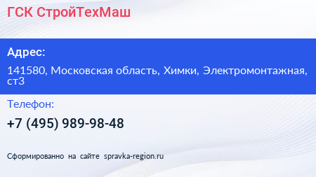 ГСК СтройТехМаш по адресу 141580, Московская область, Химки, Электромонтажная, ст3 в дальнейшем Организация, размещена в следующих категориях:
