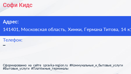 Софи Кидс по адресу 141401, Московская область, Химки, Германа Титова, 14 к1 в дальнейшем Организация, размещена в следующих категориях: