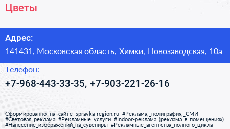 Цветы+ по адресу 141431, Московская область, Химки, Новозаводская, 10а в дальнейшем Организация, размещена в следующих категориях: