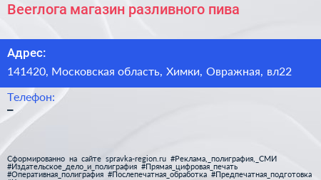 Beerлога, магазин разливного пива по адресу 141420, Московская область, Химки, Овражная, вл22 в дальнейшем Организация, размещена в следующих категориях: