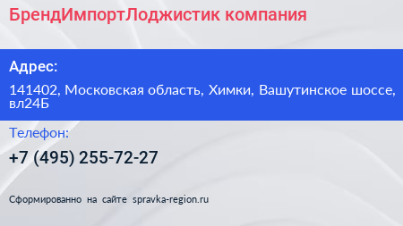 БрендИмпортЛоджистик, компания по адресу 141402, Московская область, Химки, Вашутинское шоссе, вл24Б в дальнейшем Организация, размещена в следующих категориях: