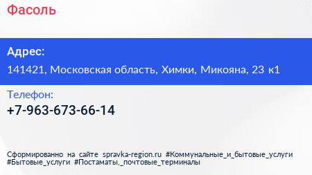 Фасоль по адресу 141421, Московская область, Химки, Микояна, 23 к1 в дальнейшем Организация, размещена в следующих категориях: