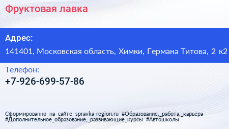 Фруктовая лавка по адресу 141401, Московская область, Химки, Германа Титова, 2 к2 в дальнейшем Организация, размещена в следующих категориях: