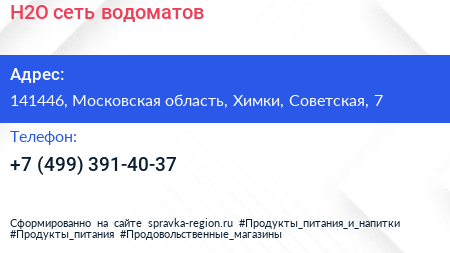 H2O, сеть водоматов по адресу 141446, Московская область, Химки, Советская, 7 в дальнейшем Организация, размещена в следующих категориях: