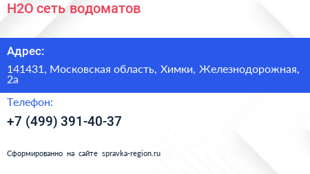 H2O, сеть водоматов по адресу 141431, Московская область, Химки, Железнодорожная, 2а в дальнейшем Организация, размещена в следующих категориях: