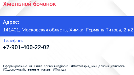 Хмельной бочонок по адресу 141401, Московская область, Химки, Германа Титова, 2 к2 в дальнейшем Организация, размещена в следующих категориях: