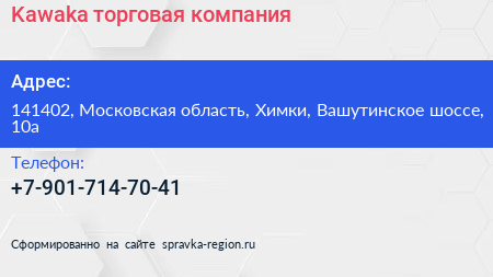 Kawaka, торговая компания по адресу 141402, Московская область, Химки, Вашутинское шоссе, 10а в дальнейшем Организация, размещена в следующих категориях:
