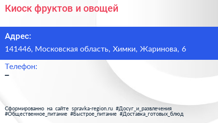 Киоск фруктов и овощей по адресу 141446, Московская область, Химки, Жаринова, 6 в дальнейшем Организация, размещена в следующих категориях: