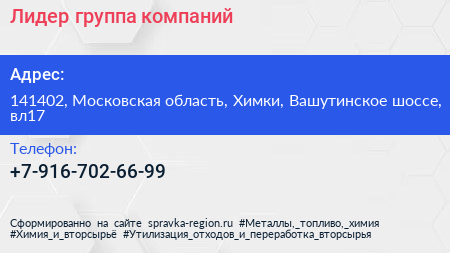 Лидер, группа компаний по адресу 141402, Московская область, Химки, Вашутинское шоссе, вл17 в дальнейшем Организация, размещена в следующих категориях: