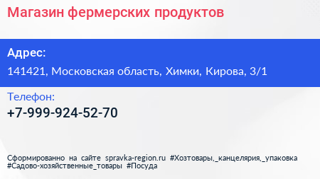 Магазин фермерских продуктов по адресу 141421, Московская область, Химки, Кирова, 3/1 в дальнейшем Организация, размещена в следующих категориях: