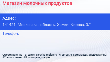 Магазин молочных продуктов по адресу 141421, Московская область, Химки, Кирова, 3/1 в дальнейшем Организация, размещена в следующих категориях: