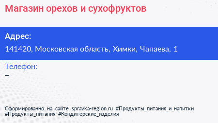 Магазин орехов и сухофруктов по адресу 141420, Московская область, Химки, Чапаева, 1 в дальнейшем Организация, размещена в следующих категориях: