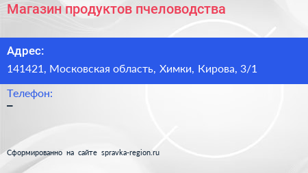 Магазин продуктов пчеловодства по адресу 141421, Московская область, Химки, Кирова, 3/1 в дальнейшем Организация, размещена в следующих категориях: