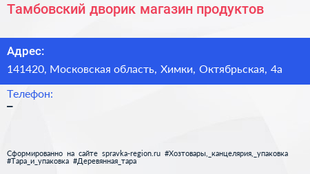Тамбовский дворик, магазин продуктов по адресу 141420, Московская область, Химки, Октябрьская, 4а в дальнейшем Организация, размещена в следующих категориях: