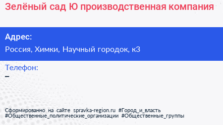 Зелёный сад-Ю, производственная компания по адресу Старый корпус ФНЦ ВИК имени В.Р. Вильямса, к3, улица Научный Городок, Луговая, городской округ Лобня, Московская область, Центральный федеральный округ, 141730, Россия в дальнейшем Организация, размещена в следующих категориях: