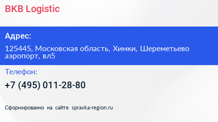 BKB Logistic по адресу 125445, Московская область, Химки, Шереметьево аэропорт, вл5 в дальнейшем Организация, размещена в следующих категориях: