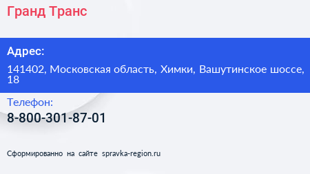 Гранд Транс по адресу 141402, Московская область, Химки, Вашутинское шоссе, 18 в дальнейшем Организация, размещена в следующих категориях: