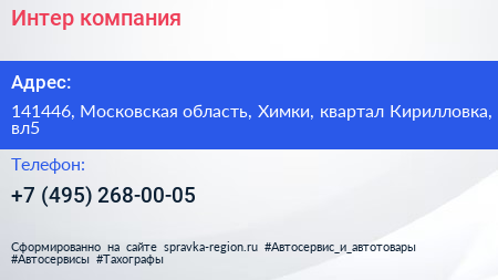 Интер, компания по адресу 141446, Московская область, Химки, квартал Кирилловка, вл5 в дальнейшем Организация, размещена в следующих категориях: