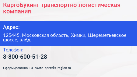 КаргоБукинг, транспортно-логистическая компания по адресу 125445, Московская область, Химки, Шереметьевское шоссе, вл6д в дальнейшем Организация, размещена в следующих категориях: