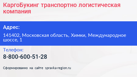 КаргоБукинг, транспортно-логистическая компания по адресу 141402, Московская область, Химки, Международное шоссе, 1 в дальнейшем Организация, размещена в следующих категориях:
