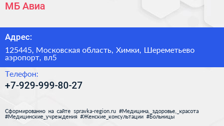 МБ-Авиа по адресу 125445, Московская область, Химки, Шереметьево аэропорт, вл5 в дальнейшем Организация, размещена в следующих категориях: