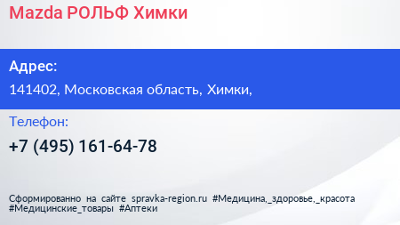 Mazda РОЛЬФ Химки по адресу 141402, Московская область, Химки, в дальнейшем Организация, размещена в следующих категориях: