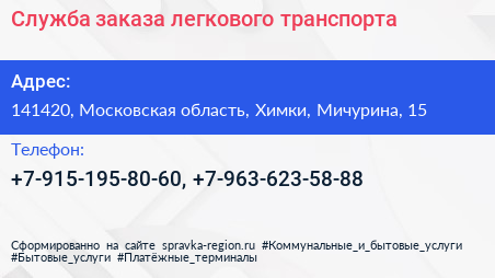 Служба заказа легкового транспорта по адресу 141420, Московская область, Химки, Мичурина, 15 в дальнейшем Организация, размещена в следующих категориях:
