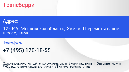 Трансберри по адресу 125445, Московская область, Химки, Шереметьевское шоссе, вл6к в дальнейшем Организация, размещена в следующих категориях: