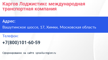 Каргов Лоджистикс - международная транспортная компания по адресу Вашутинское шоссе, 17, Химки, Московская область в дальнейшем Организация, размещена в следующих категориях:
