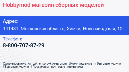 Hobbymod, магазин сборных моделей по адресу 141431, Московская область, Химки, Новозаводская, 10 в дальнейшем Организация, размещена в следующих категориях: