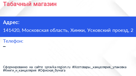 Табачный магазин по адресу 141420, Московская область, Химки, Усковский проезд, 2 в дальнейшем Организация, размещена в следующих категориях: