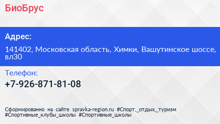 БиоБрус по адресу 141402, Московская область, Химки, Вашутинское шоссе, вл30 в дальнейшем Организация, размещена в следующих категориях:
