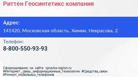 Риттен Геосинтетикс, компания по адресу 141420, Московская область, Химки, Некрасова, 2 в дальнейшем Организация, размещена в следующих категориях: