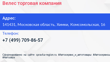 Велес, торговая компания по адресу 141431, Московская область, Химки, Комсомольская, 16 в дальнейшем Организация, размещена в следующих категориях: