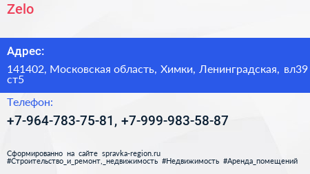 Zelo по адресу 141402, Московская область, Химки, Ленинградская, вл39 ст5 в дальнейшем Организация, размещена в следующих категориях:
