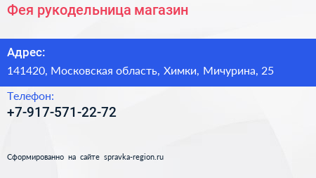 Фея-рукодельница, магазин по адресу 141420, Московская область, Химки, Мичурина, 25 в дальнейшем Организация, размещена в следующих категориях: