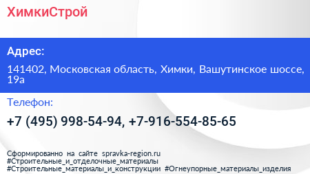 ХимкиСтрой по адресу 141402, Московская область, Химки, Вашутинское шоссе, 19а в дальнейшем Организация, размещена в следующих категориях: