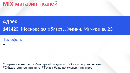 MIX, магазин тканей по адресу 141420, Московская область, Химки, Мичурина, 25 в дальнейшем Организация, размещена в следующих категориях:
