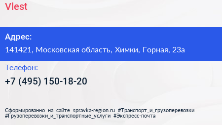 Vlest по адресу 141421, Московская область, Химки, Горная, 23а в дальнейшем Организация, размещена в следующих категориях: