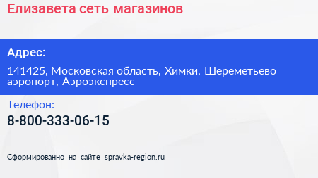 Елизавета, сеть магазинов по адресу 141425, Московская область, Химки, Шереметьево аэропорт, Аэроэкспресс в дальнейшем Организация, размещена в следующих категориях:
