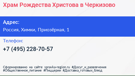 Храм Рождества Христова в Черкизово по адресу Храм Рождества Христова в Черкизове, 354/1, Ленинградское шоссе, Черкизово, Молжаниновский район, Новоподрезково, Москва, Центральный федеральный округ, 141431, Россия в дальнейшем Организация, размещена в следующих категориях: