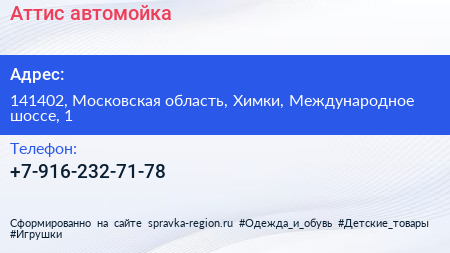 Аттис, автомойка по адресу 141402, Московская область, Химки, Международное шоссе, 1 в дальнейшем Организация, размещена в следующих категориях: