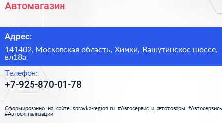 Автомагазин по адресу 141402, Московская область, Химки, Вашутинское шоссе, вл18а в дальнейшем Организация, размещена в следующих категориях:
